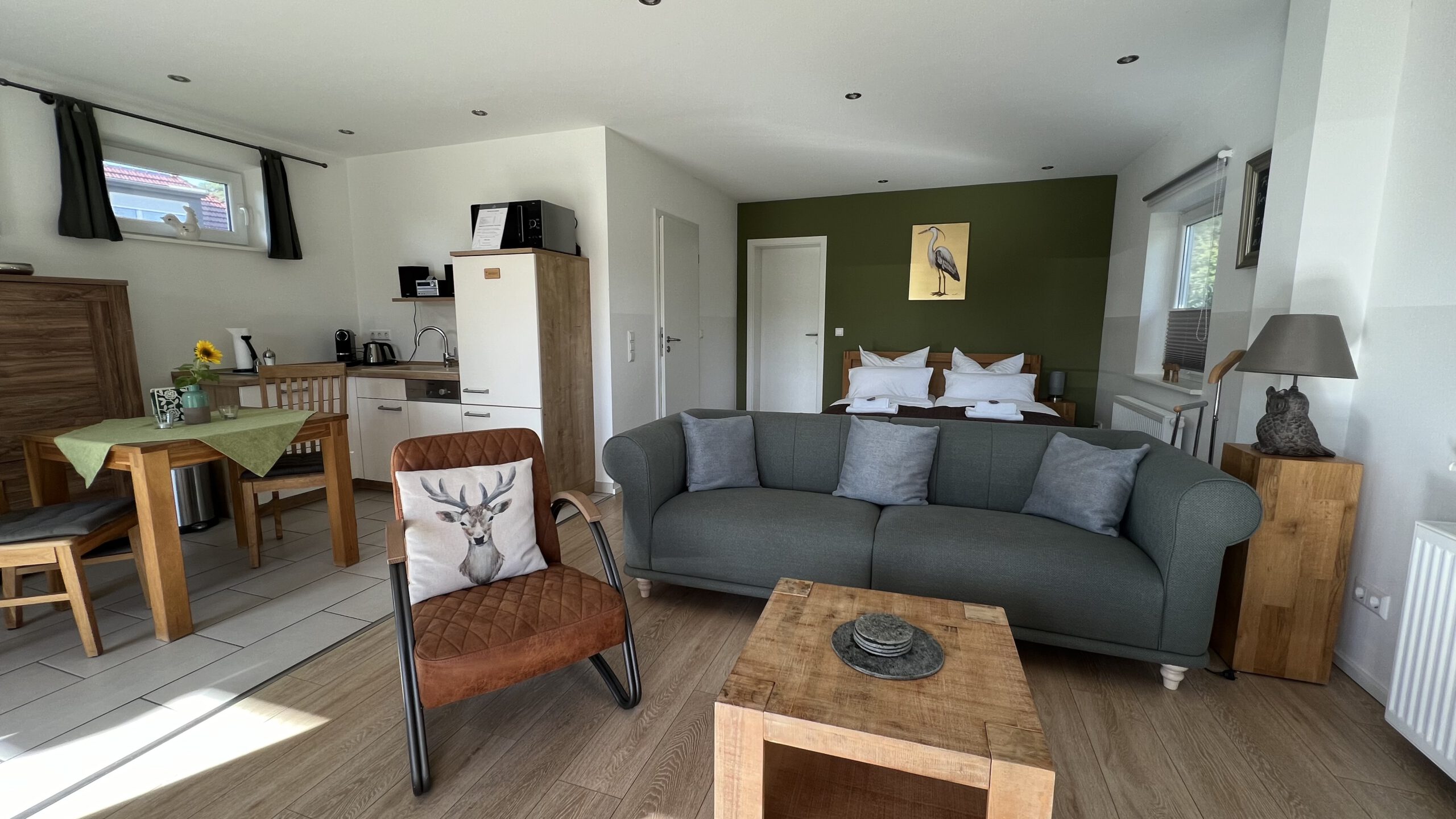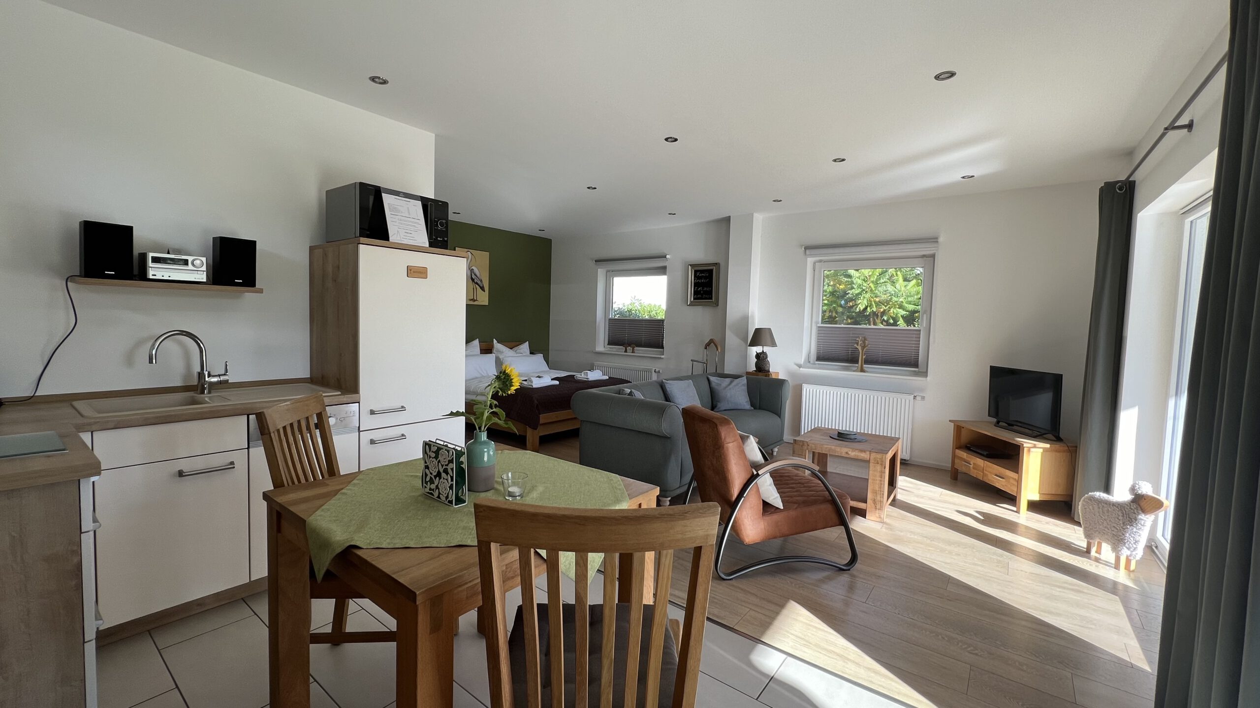 Apartment 2: Wohn,-Schlafbereich, Einbauküche und Bad.