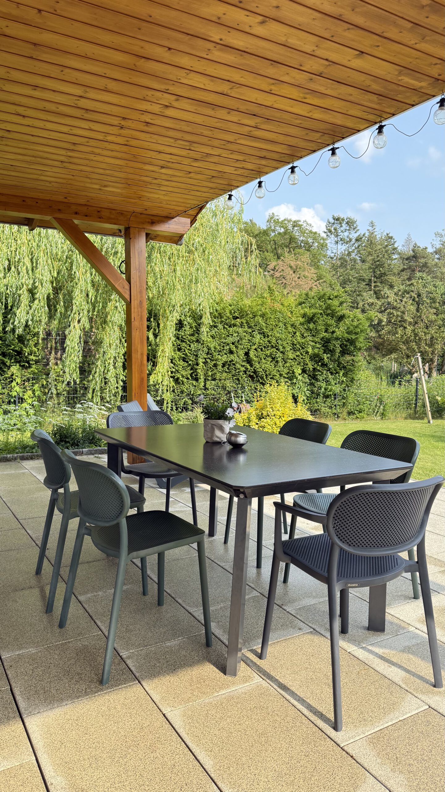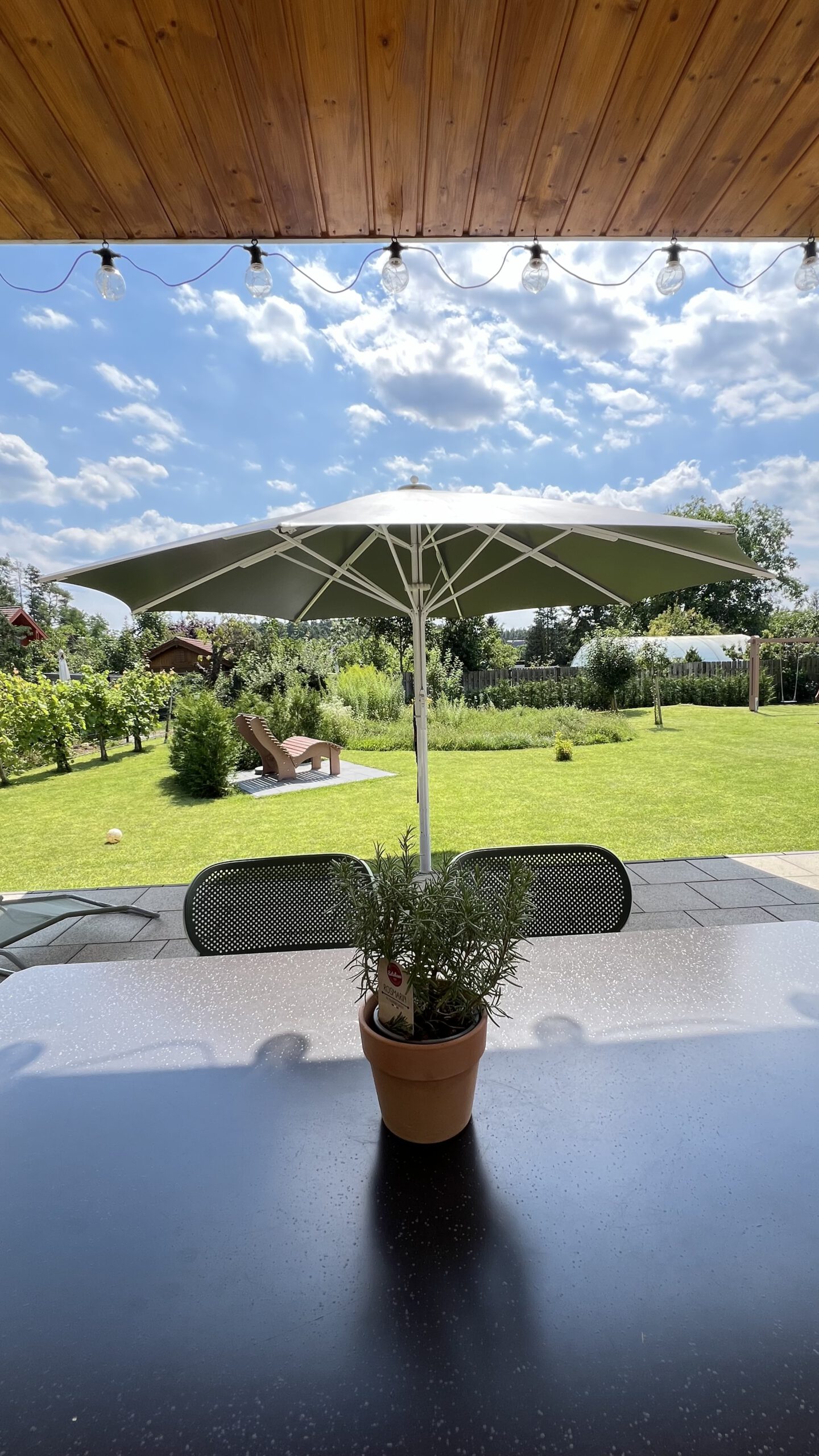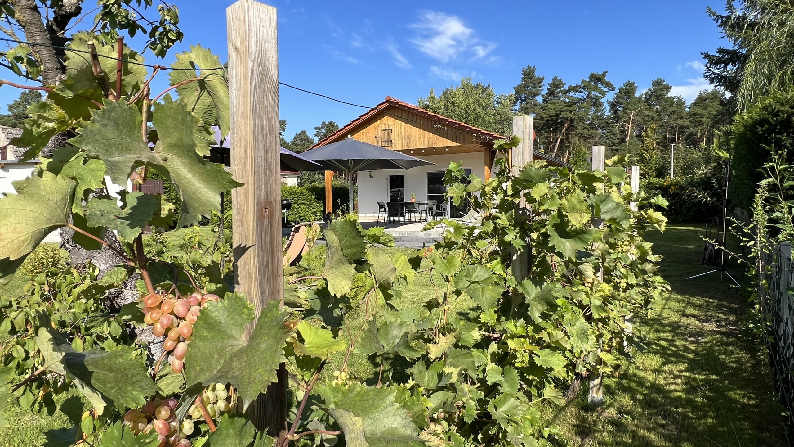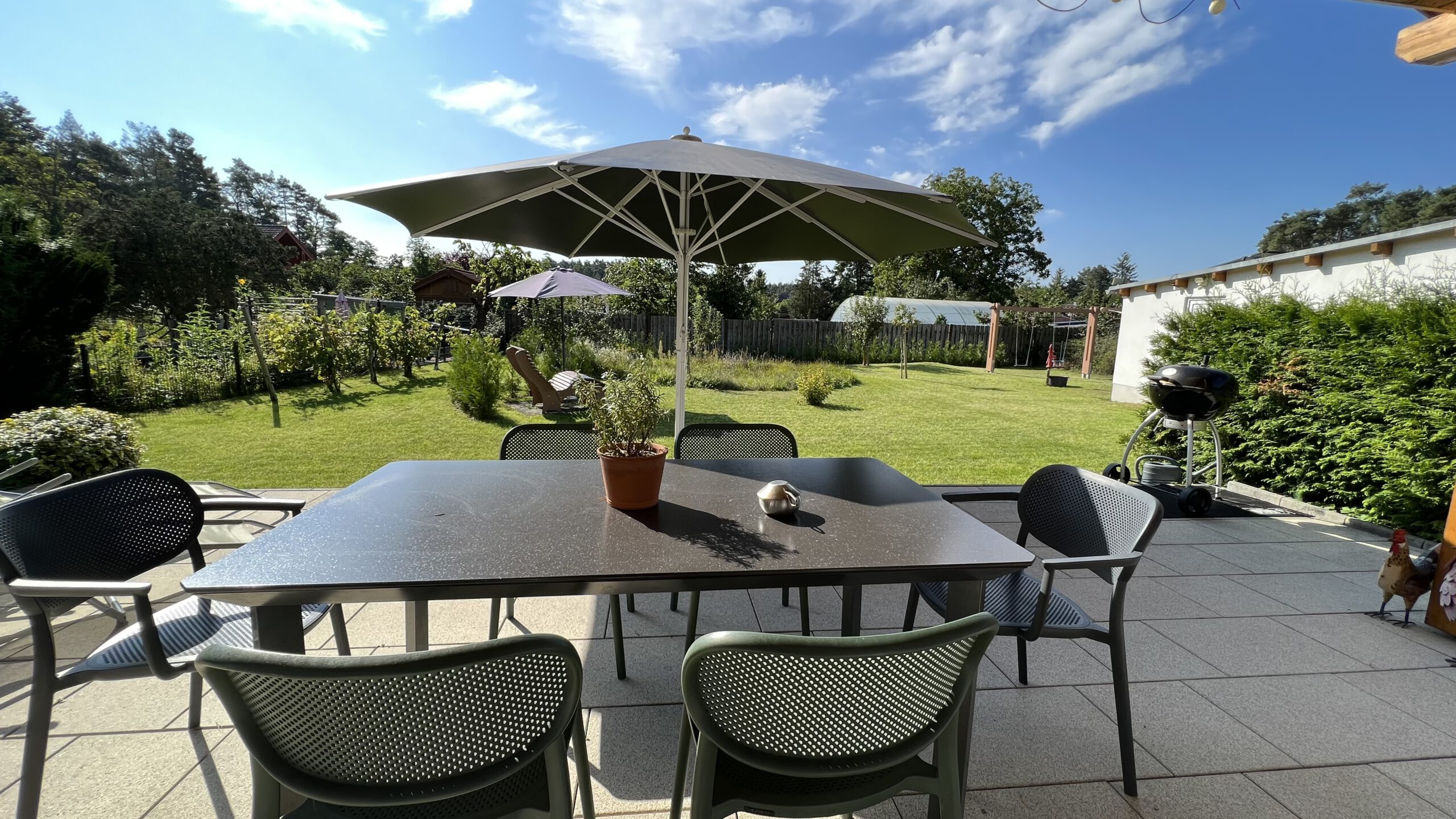 An warmen Sommertagen lädt der Garten zum Sonnen und Entspannen ein. Für Erfrischung sorgt eine Gartendusche, und natürlich darf auch der Grillabend unter freiem Himmel nicht fehlen.
