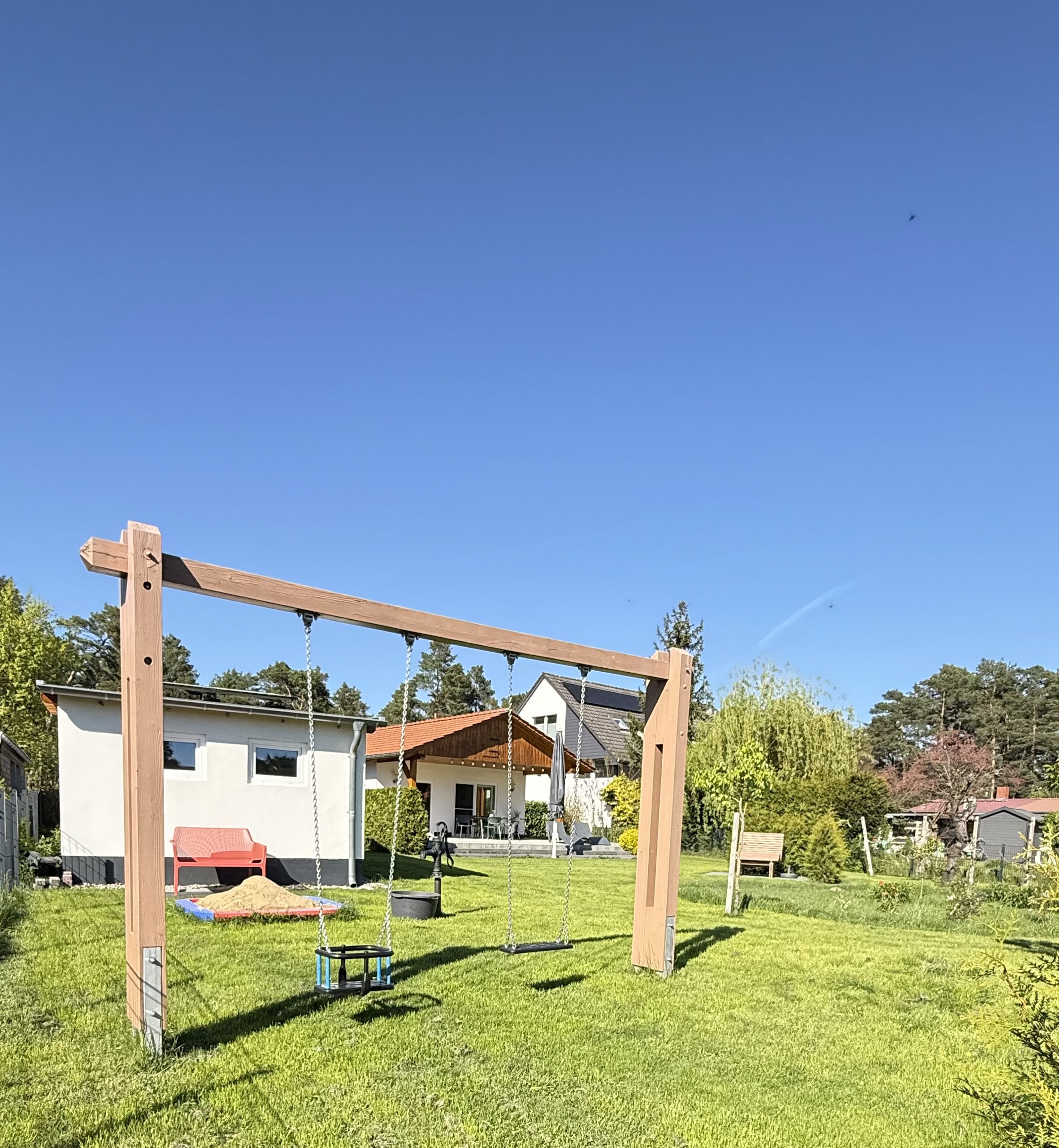 Obstbäume, blühende Sträucher und eine natürliche Bienenwiese schaffen eine idyllische Atmosphäre. Für die kleinen Gäste gibt es einen Spielplatz mit Schaukel und Sandkasten sowie eine Handschwengelpumpe, mit der selbst Wasser gefördert werden kann – ein echtes Erlebnis für Groß und Klein.