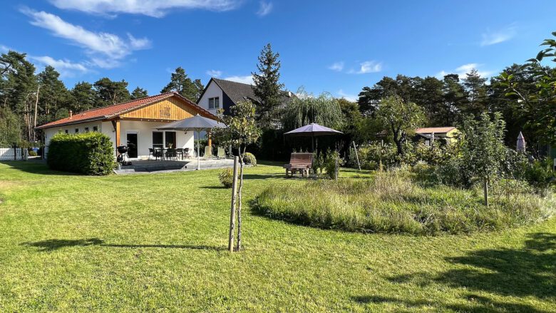 Das Ferienhaus – unser Familienparadies – mit exklusiv nutzbarem Gartengrundstück und großer Südterrasse. Es gibt zwei Schlafzimmer, ein Wohnzimmer mit Doppelbett, einen Wohn/Essbereich und zwei Bäder mit Du und WC.