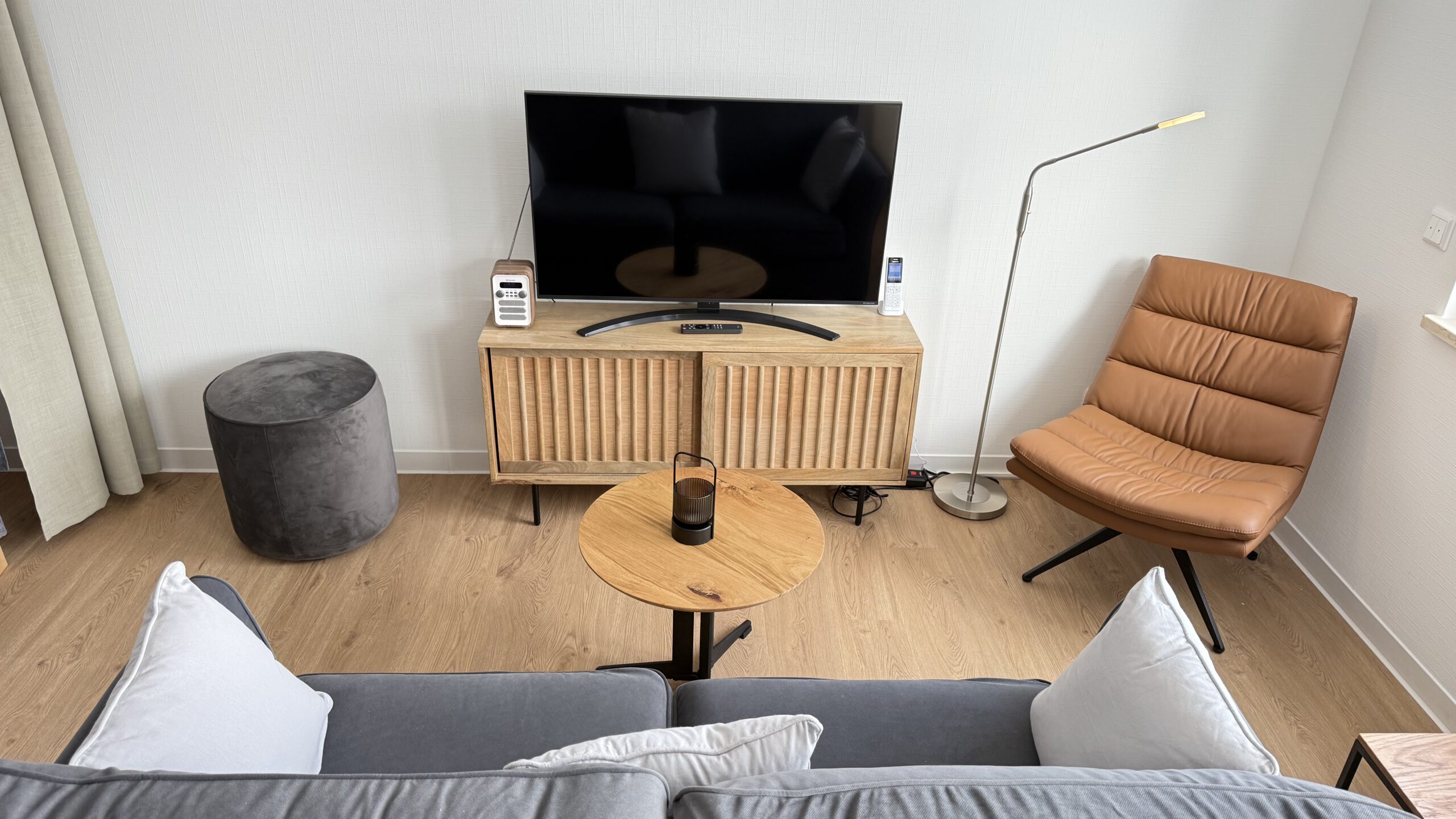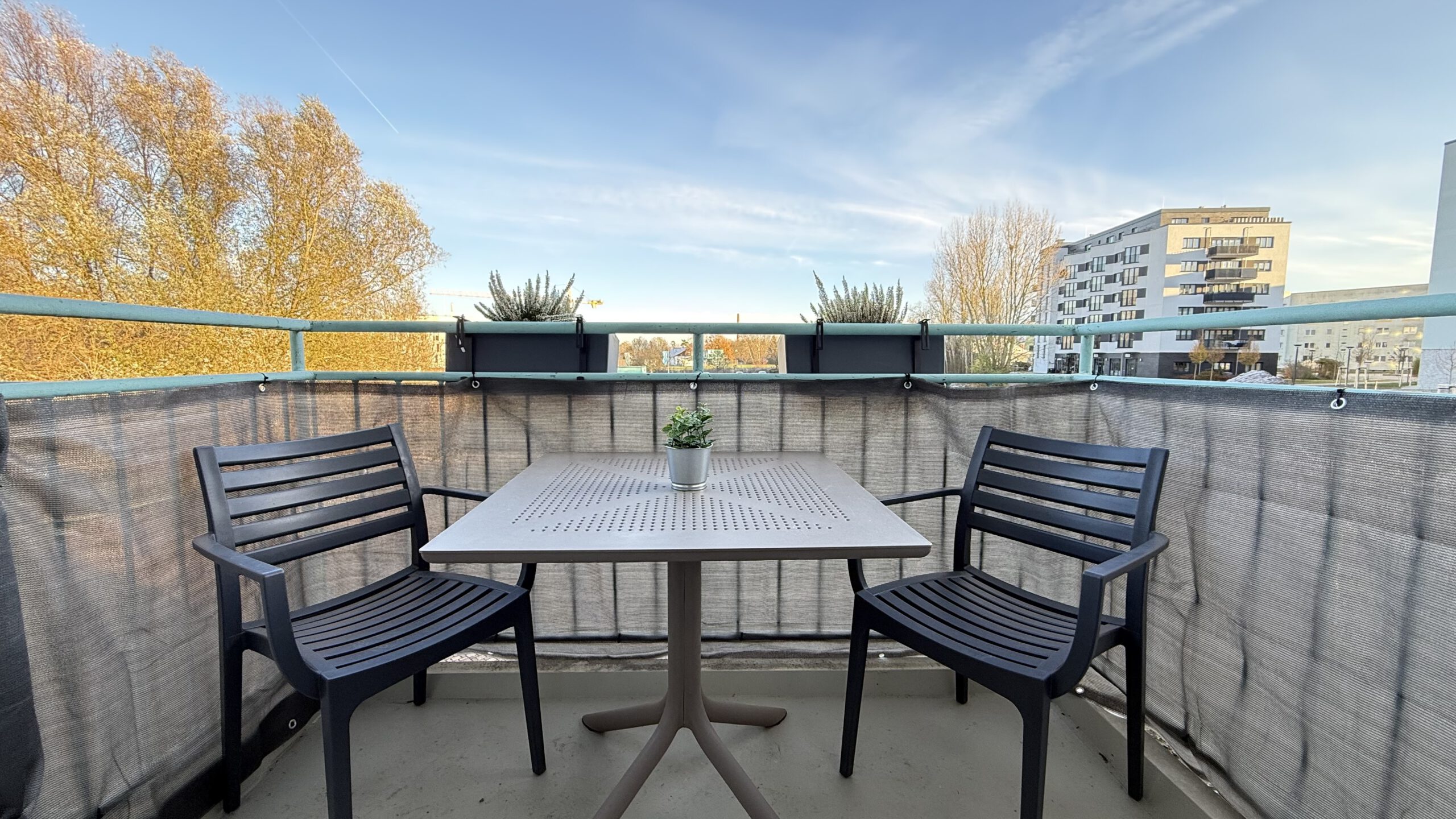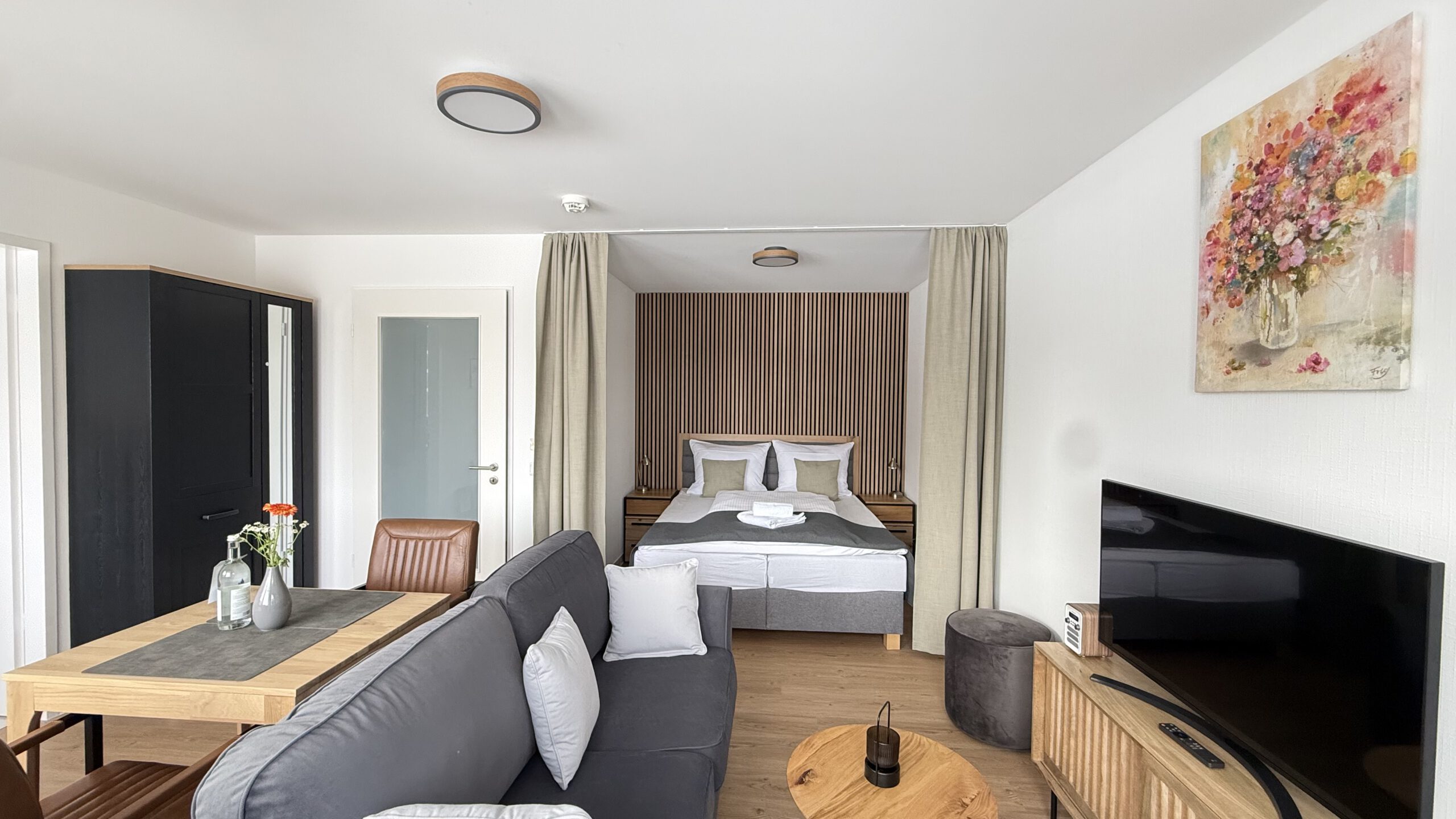 Der gemütliche Wohn- und Schlafbereich überzeugt mit einem Sofa, einem Esstisch und einer separaten Schlafnische, die mit einem komfortablen Doppel-Boxspringbett ausgestattet ist. Große Fenster sorgen für eine freundliche, lichtdurchflutete Atmosphäre. Ein Balkon lädt zum Entspannen im Freien ein. Ergänzt wird die Wohnung durch einen kleinen Flur mit Stauraum.
