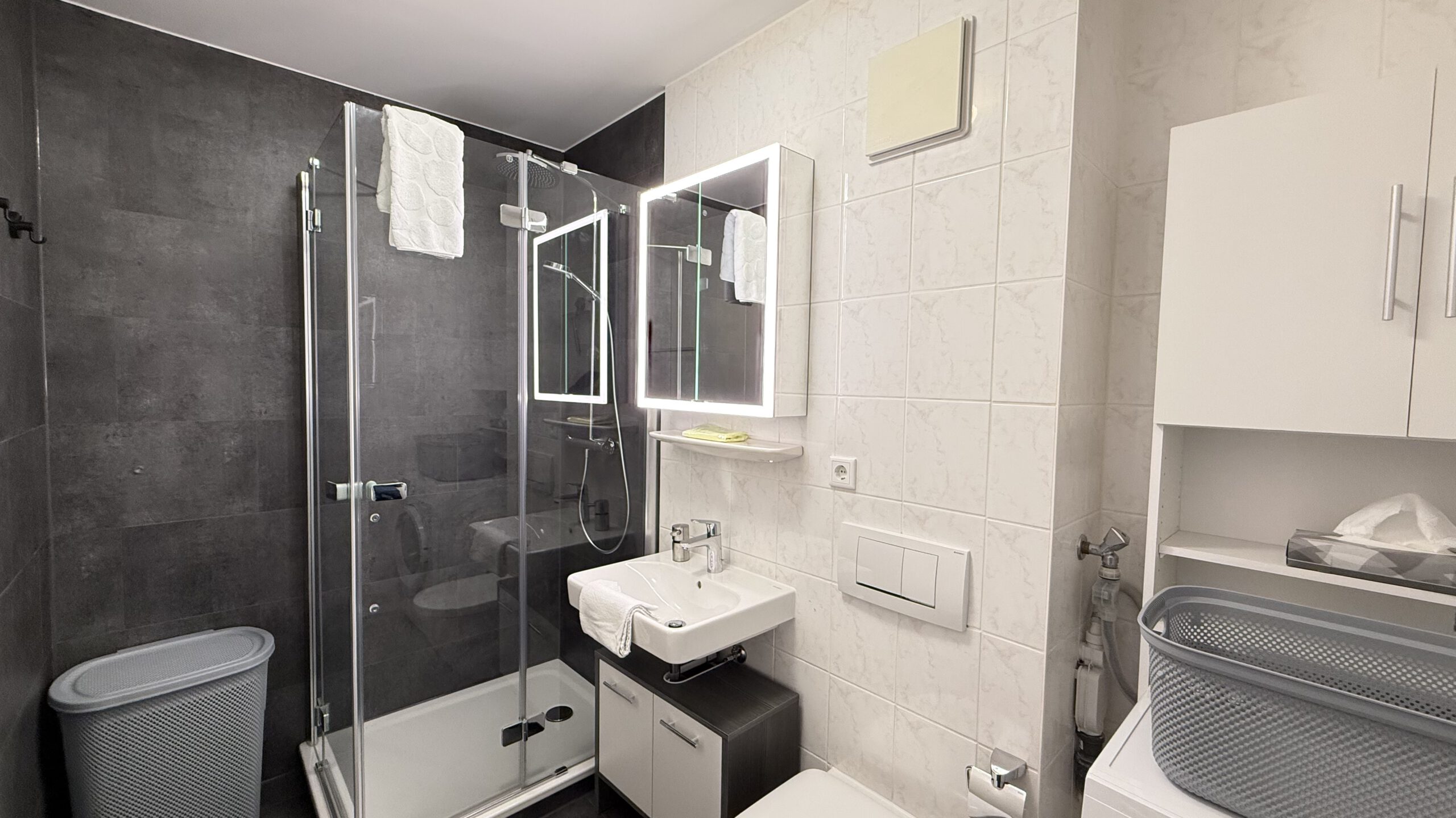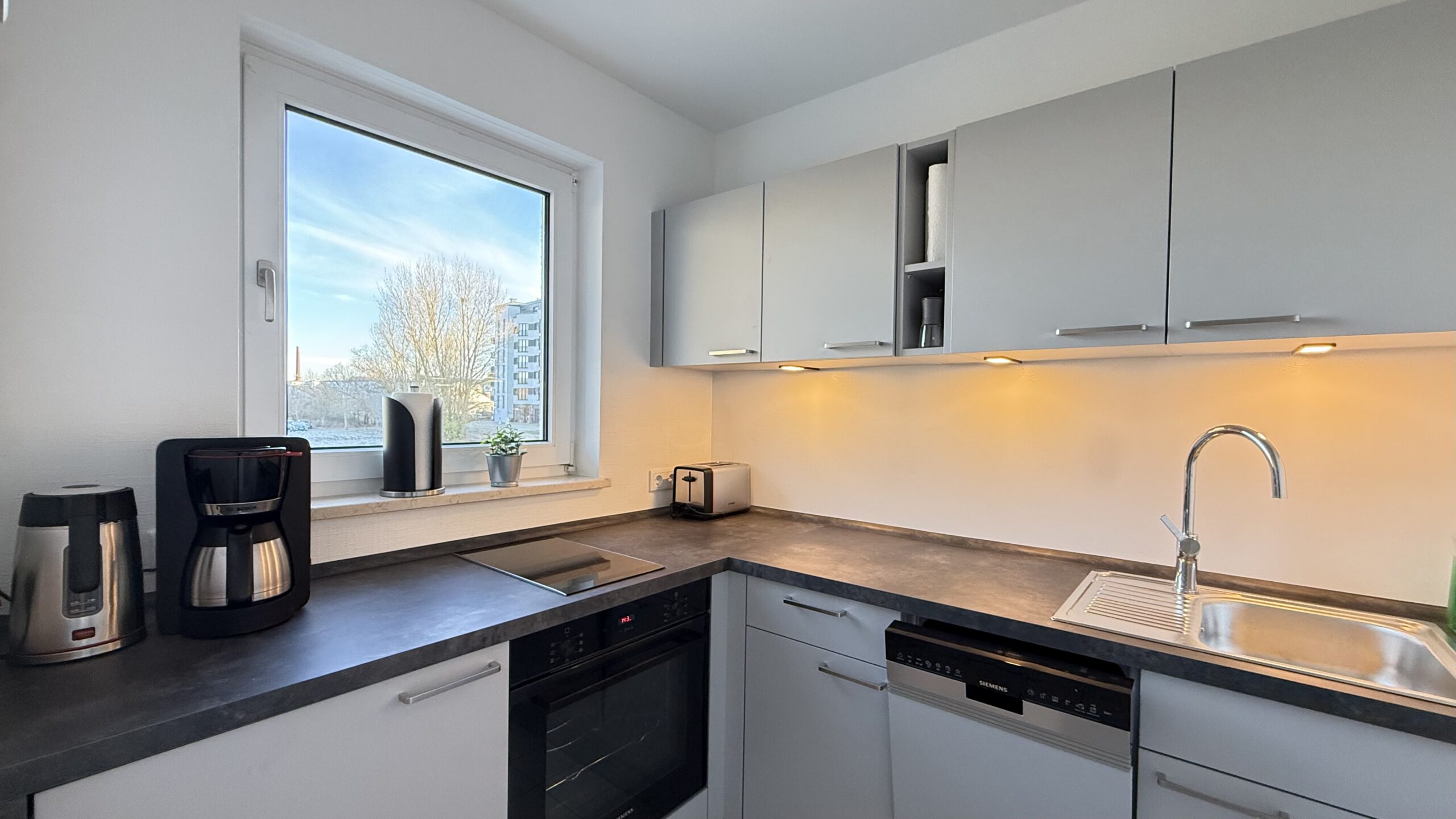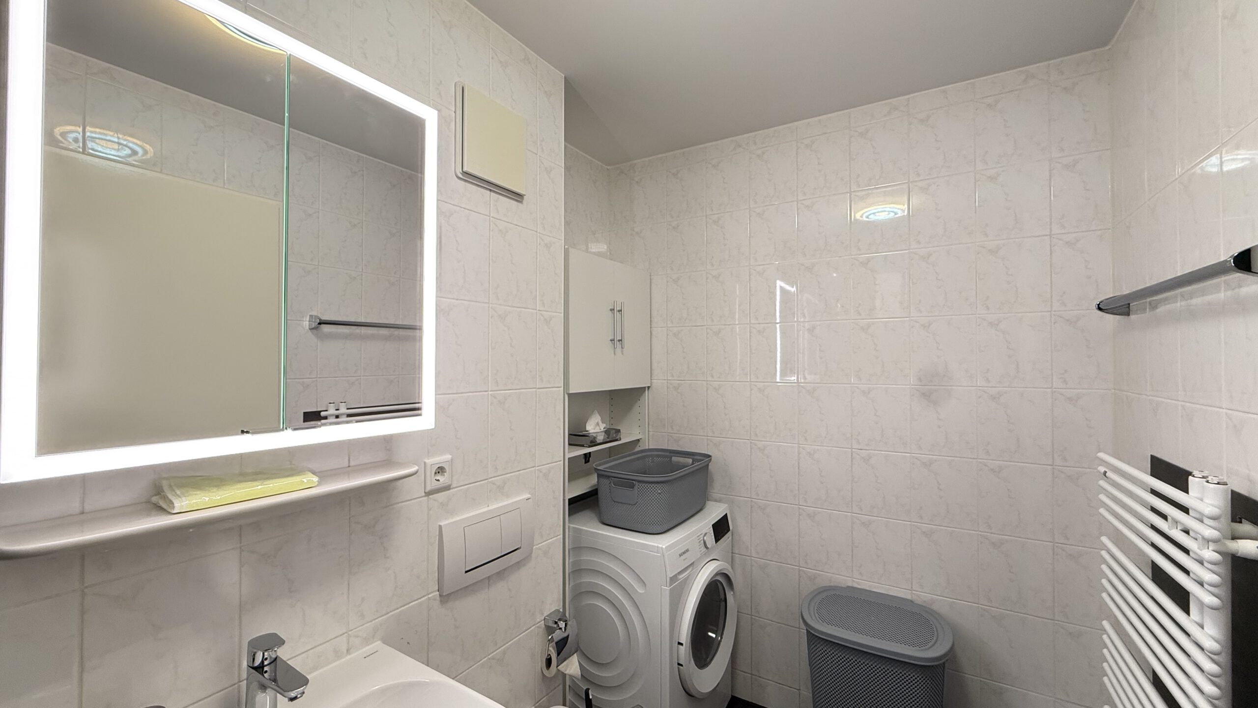 Die Wohnung verfügt über ein modernes Duschbad sowie eine Waschmaschine mit integrierter Trocknerfunktion. Die hochwertige Einbauküche ist voll ausgestattet und lässt keine Wünsche offen: Cerankochfeld, Geschirrspüler, Kühlschrank mit Tiefkühlfach sowie komplettes Besteck, Geschirr, Tassen und sämtliches Kochzubehör sind vorhanden – ideal für den sofortigen Einzug.
